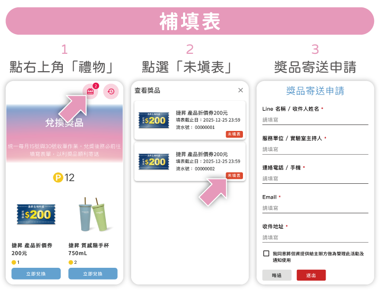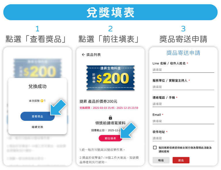 - 兌獎後,務必填寫「表單」內的寄送資料,才算完成兌獎,以利贈品送達。
